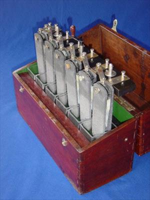 A box with 6 Grenet batteries. Here the electrodes are in the rest (up) position. 4