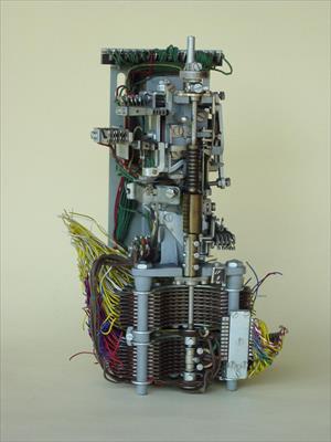 A dial element (goes up and down and rotates) of a Strowger exchange switch for automatic telephone dialing. 1