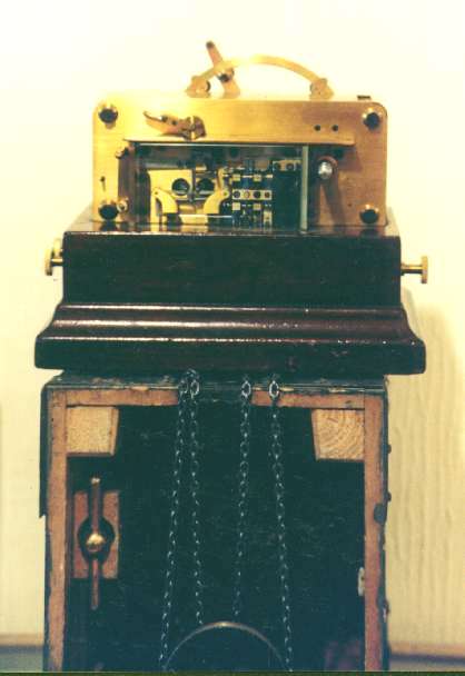 Wheatstone transmitter for Morse punched tape, circa 1875. The mechanism is driven by a weight. The transmitter is shown sitting on its original transport box. 5